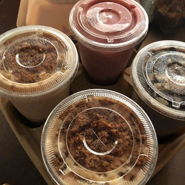 The word is out; Philly Vegan has some of the best dairy-free milkshakes in the world! And guess what...The vanilla based ice cream that we make in-house is dairy-free AND nut-free as well :) Our current milkshake flavors are Vanilla Oreo Delight, Chocolate Oreo Delight, Mama C's Peanut butter Blondie, Dreamsicle (taste like an orange pushup) Strawberry, and Banana Pudding, but keep your eyes open for special shake flavors that pop up from time to time.